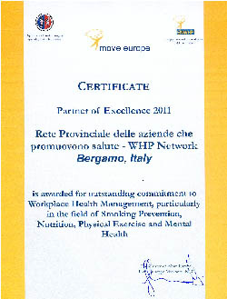 La Rete Bergamasca delle Aziende che promuovono salute, anche se giovanissima, comincia a registrare l’apprezzamento degli esperti del settore: a fine 2011 ci è stato riconosciuto il certificato “Partner di Eccellenza 2011” della Rete europea WHP.